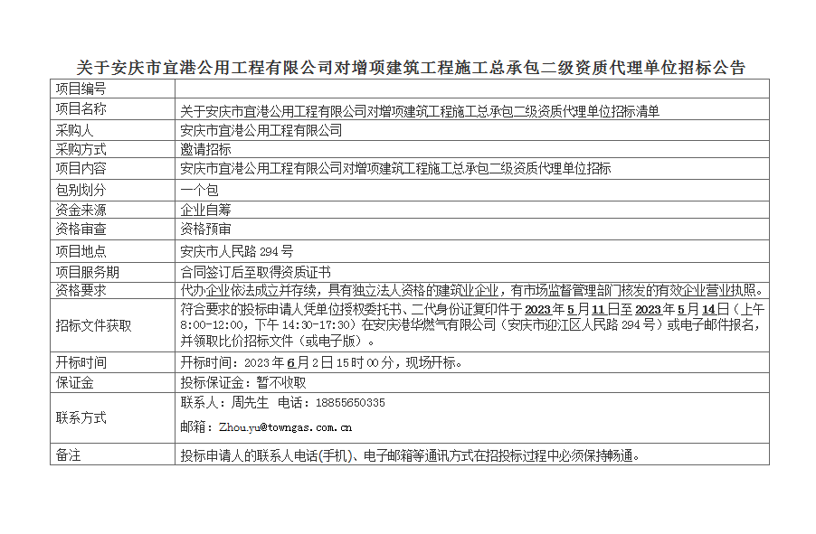 關于安慶市宜港公用工程有限公司對增項建筑工程施工總承包二級資質代理單位招標公告