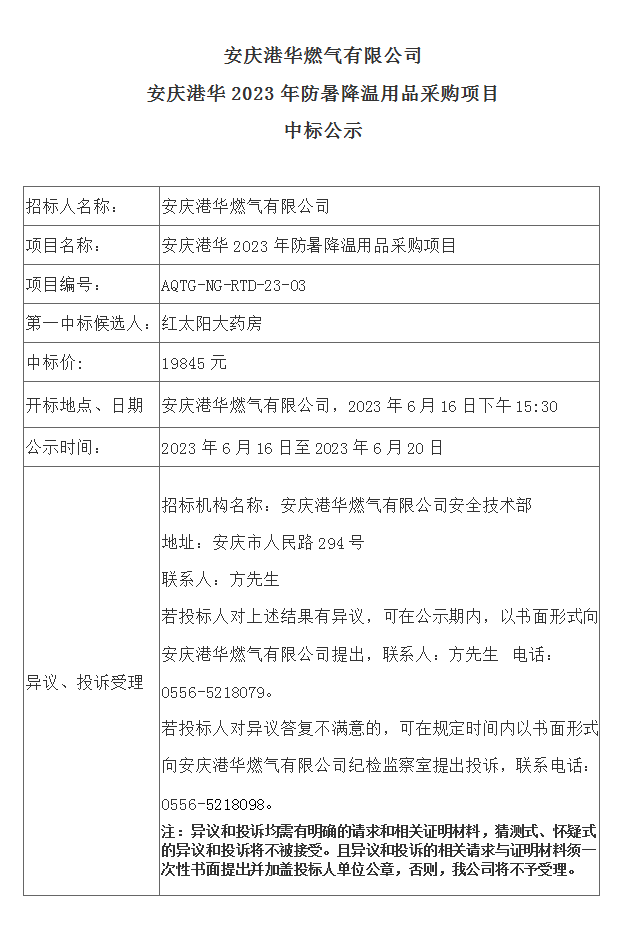 安慶港華燃?xì)庥邢薰?023年防暑降溫用品采購(gòu)項(xiàng)目中標(biāo)公示