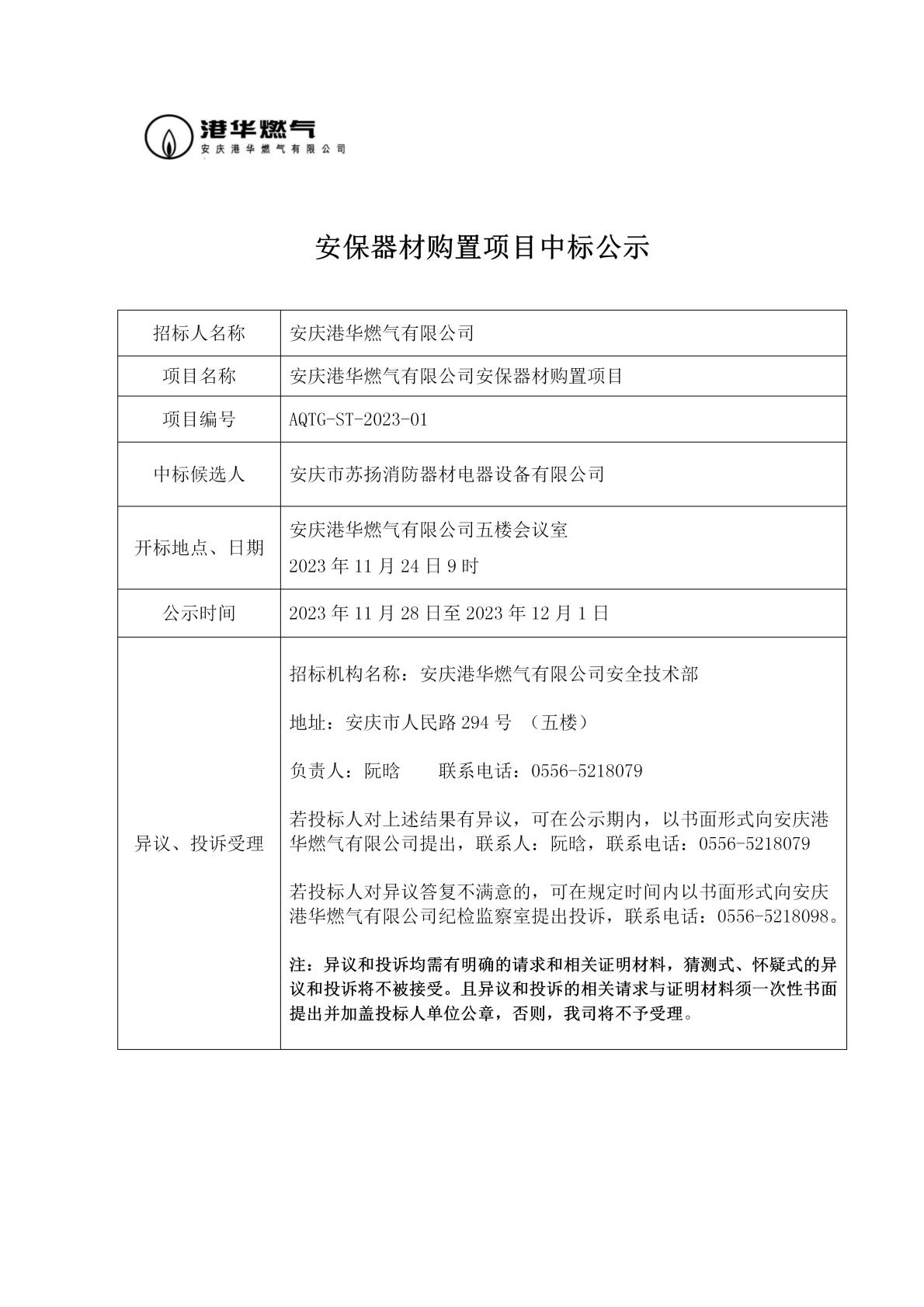 安慶港華燃?xì)庥邢薰?023年安保器材購置項(xiàng)目中標(biāo)公告
