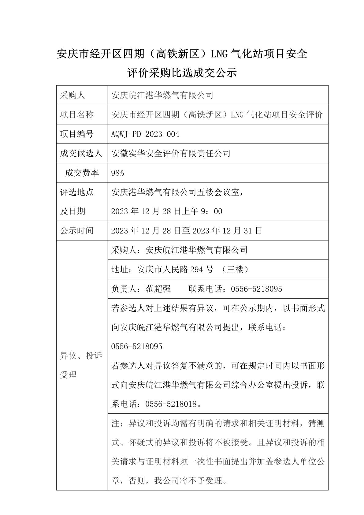 安慶市經(jīng)開區(qū)四期(高鐵新區(qū))LNG氣化站項(xiàng)目安全評(píng)價(jià)采購比選成交公示