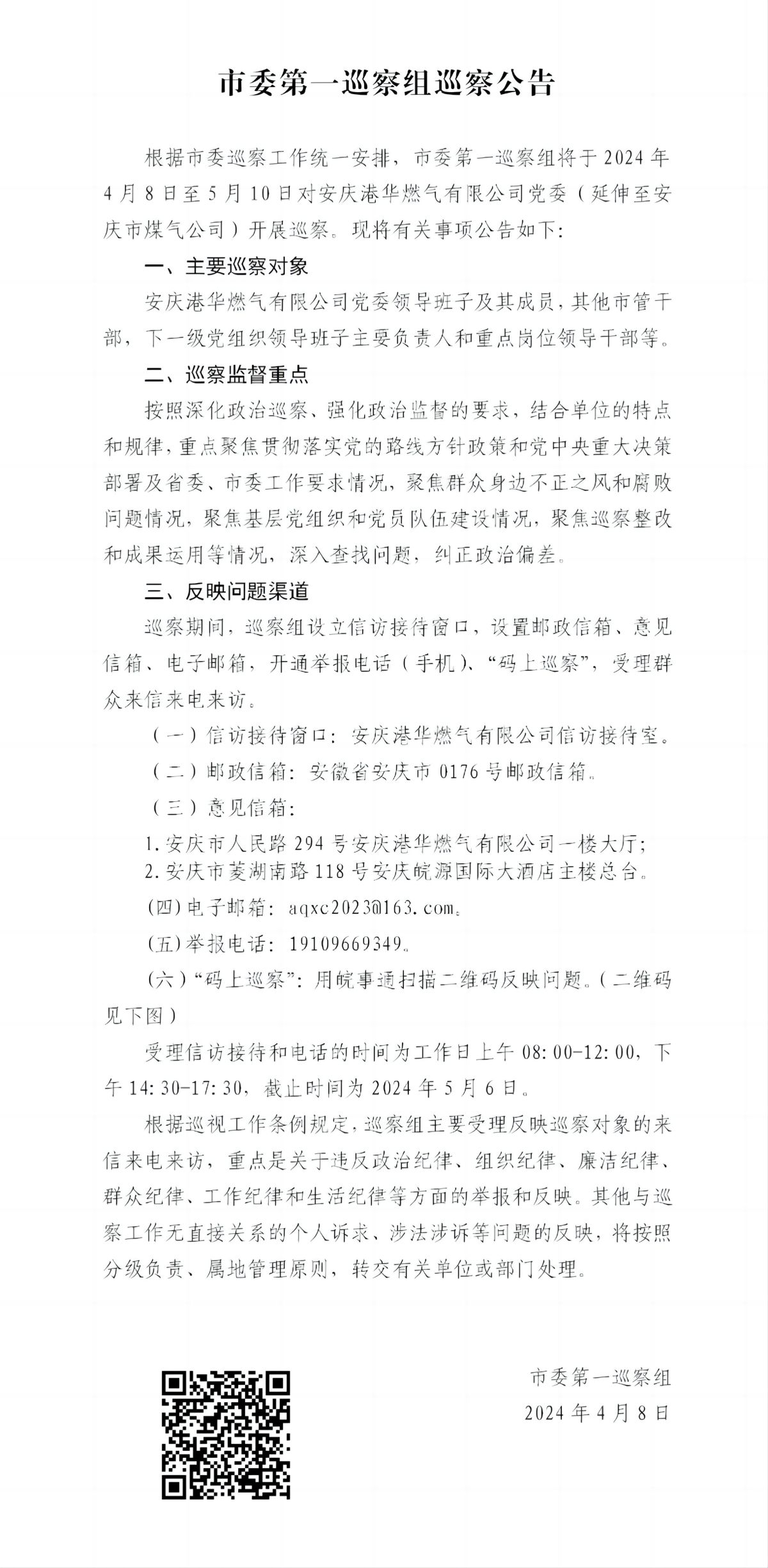 市委第一巡察組巡察公告