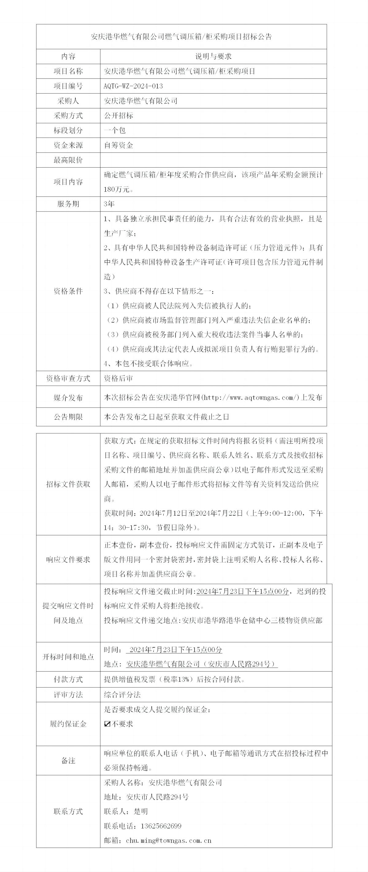 安慶港華燃氣有限公司燃氣調(diào)壓箱/柜采購項目招標(biāo)公告
