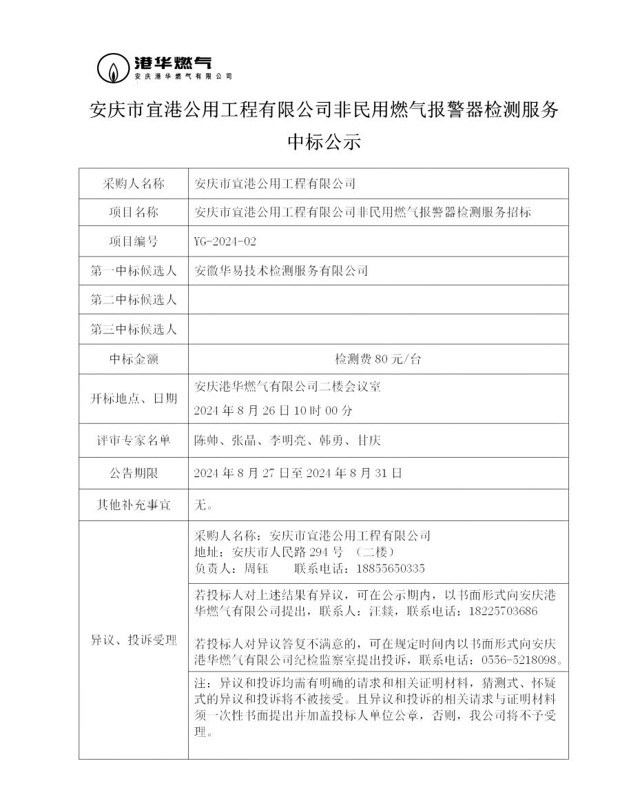 安慶市宜港公用工程有限公司非民用燃氣報警器檢測服務(wù)中標(biāo)公示