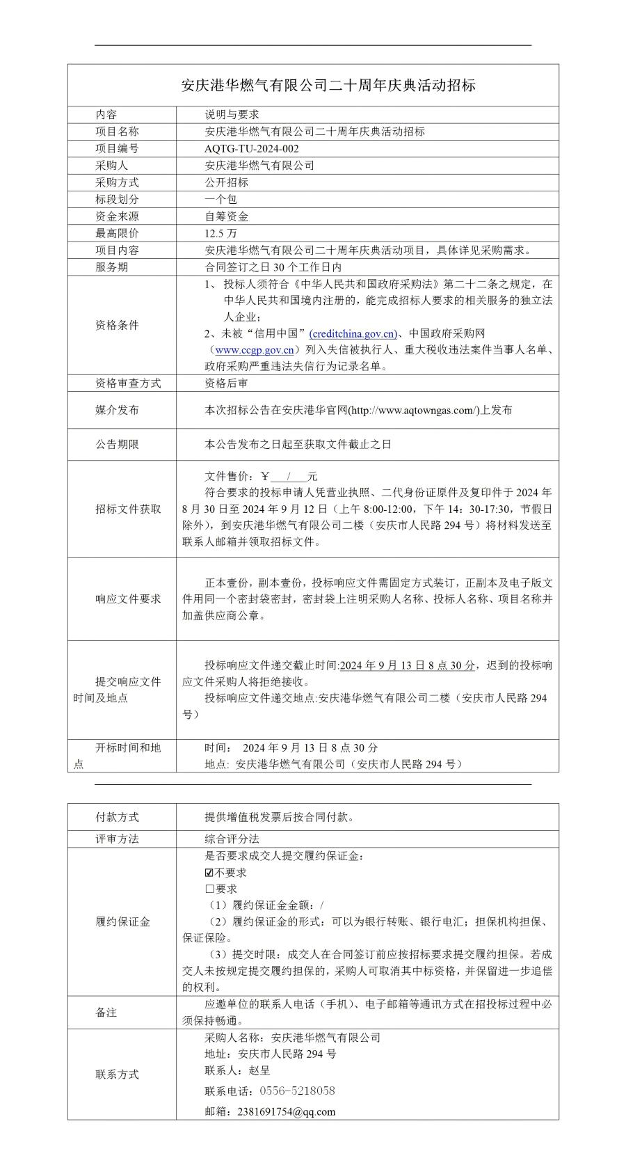 安慶港華燃氣有限公司二十周年慶典活動招標(biāo)