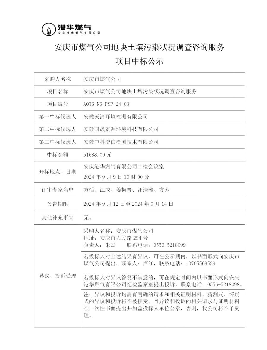安慶市煤氣公司地塊土壤污染狀況調(diào)查咨詢服務(wù)項(xiàng)目中標(biāo)公示