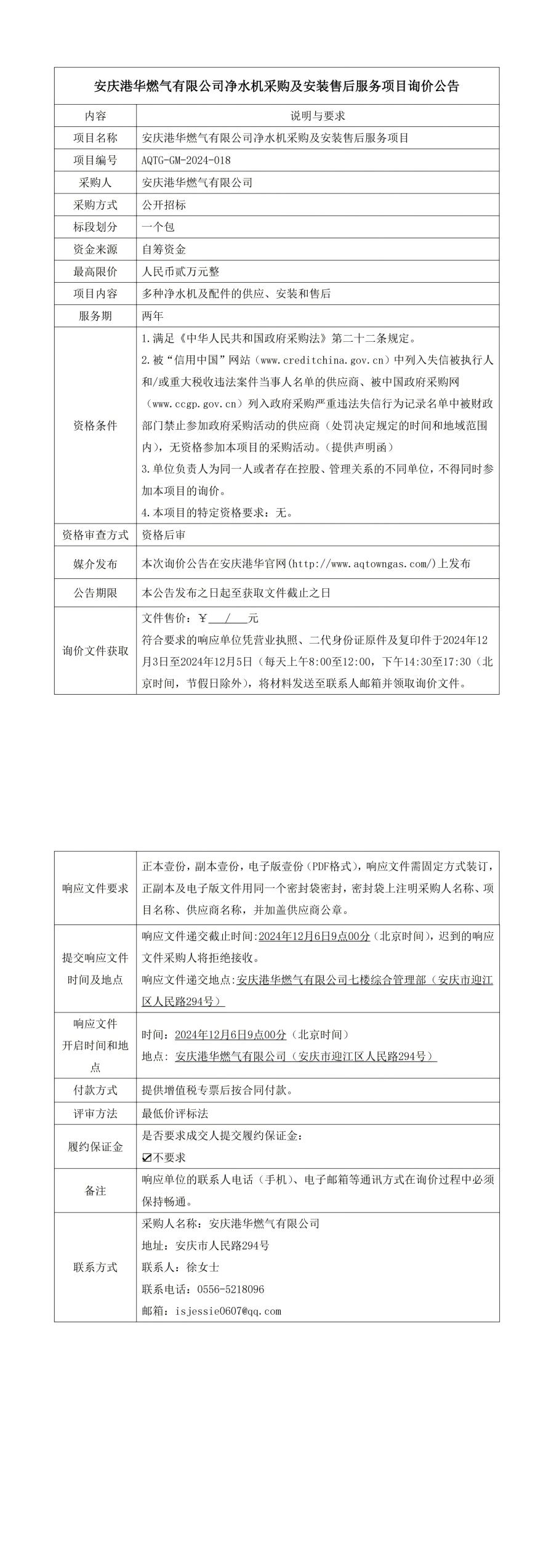 安慶港華燃?xì)庥邢薰緝羲畽C(jī)采購(gòu)及安裝售后服務(wù)項(xiàng)目詢價(jià)公告