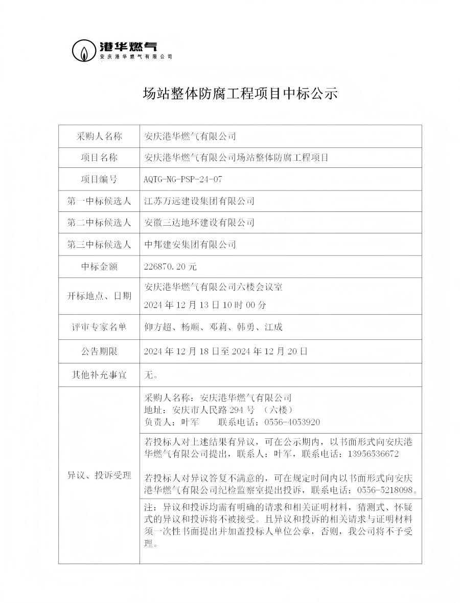 場站整體防腐工程項目中標(biāo)公示