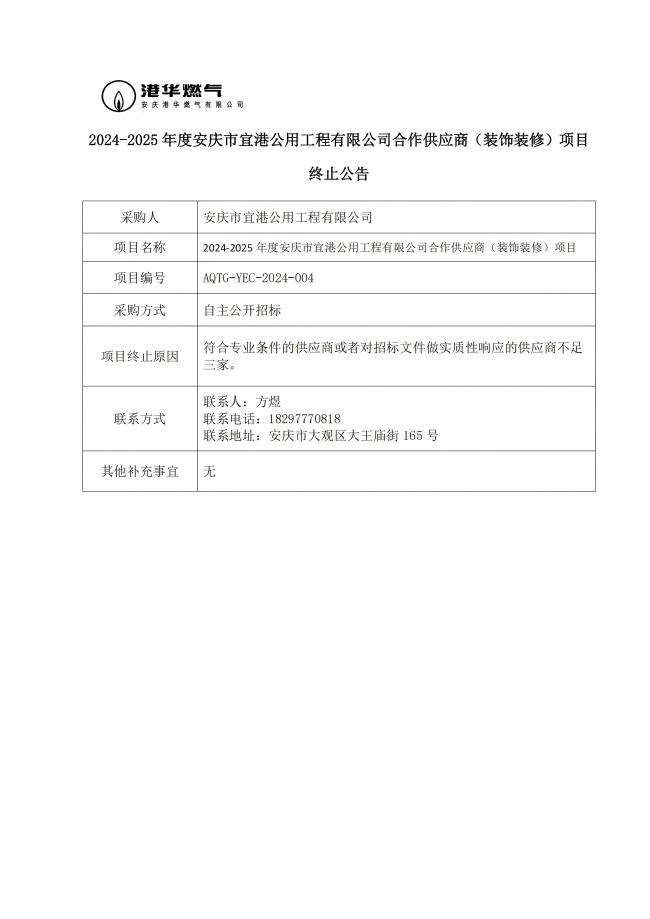 2024-2025 年度安慶市宜港公用工程有限公司合作供應(yīng)商(裝飾裝修)項目終止公告 發(fā)布時間:2024-12-20    閱讀次數(shù):2745次