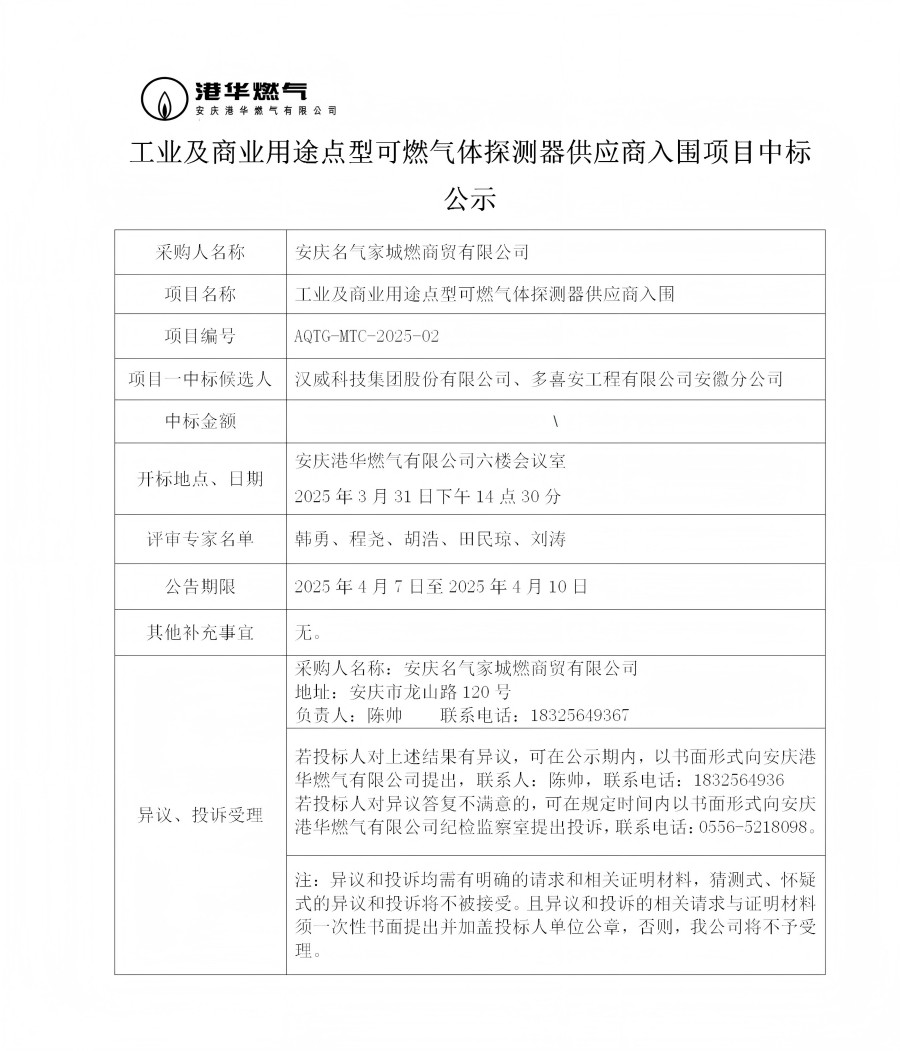 工業(yè)及商業(yè)用途點(diǎn)型可燃?xì)怏w探測(cè)器供應(yīng)商入圍項(xiàng)目中標(biāo)公示