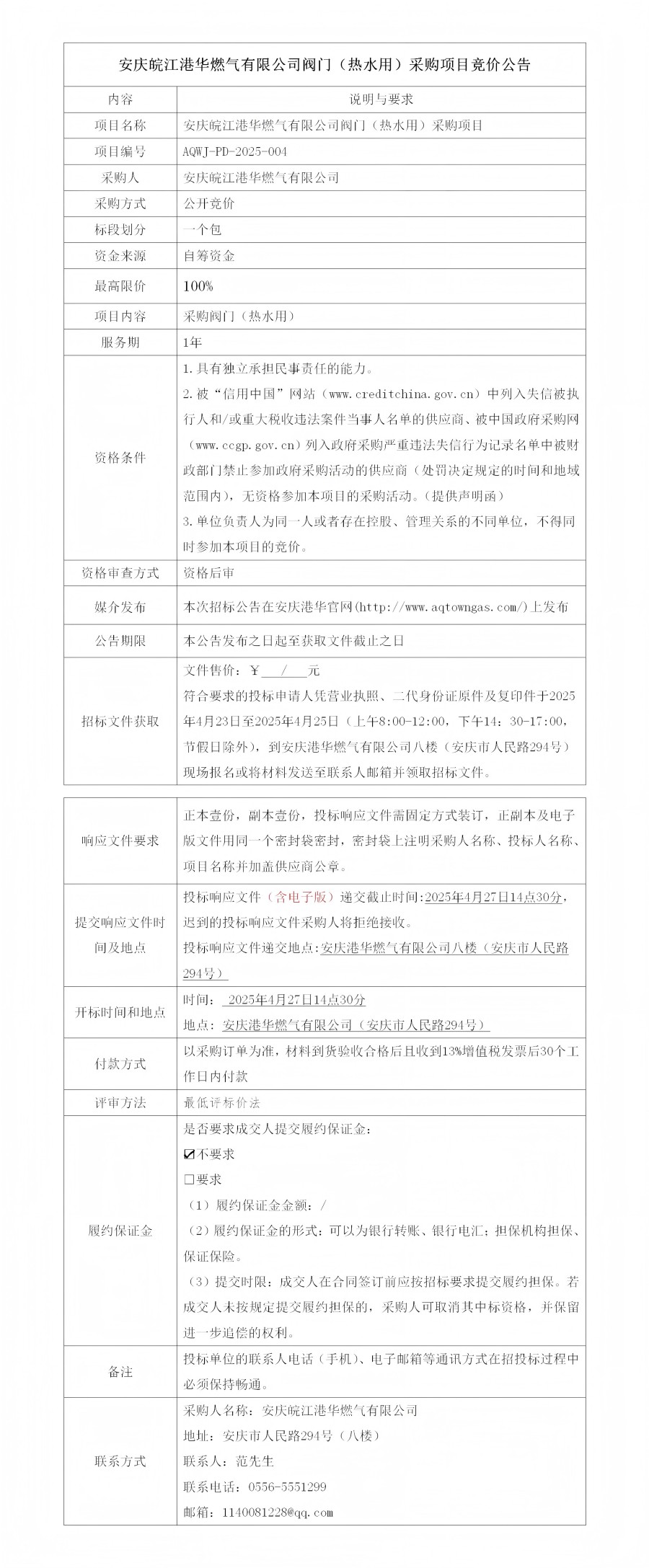 安慶皖江港華燃?xì)庥邢薰鹃y門(熱水用)采購項目競價公告 發(fā)布時間:2025-04-23    閱讀次數(shù):1729次