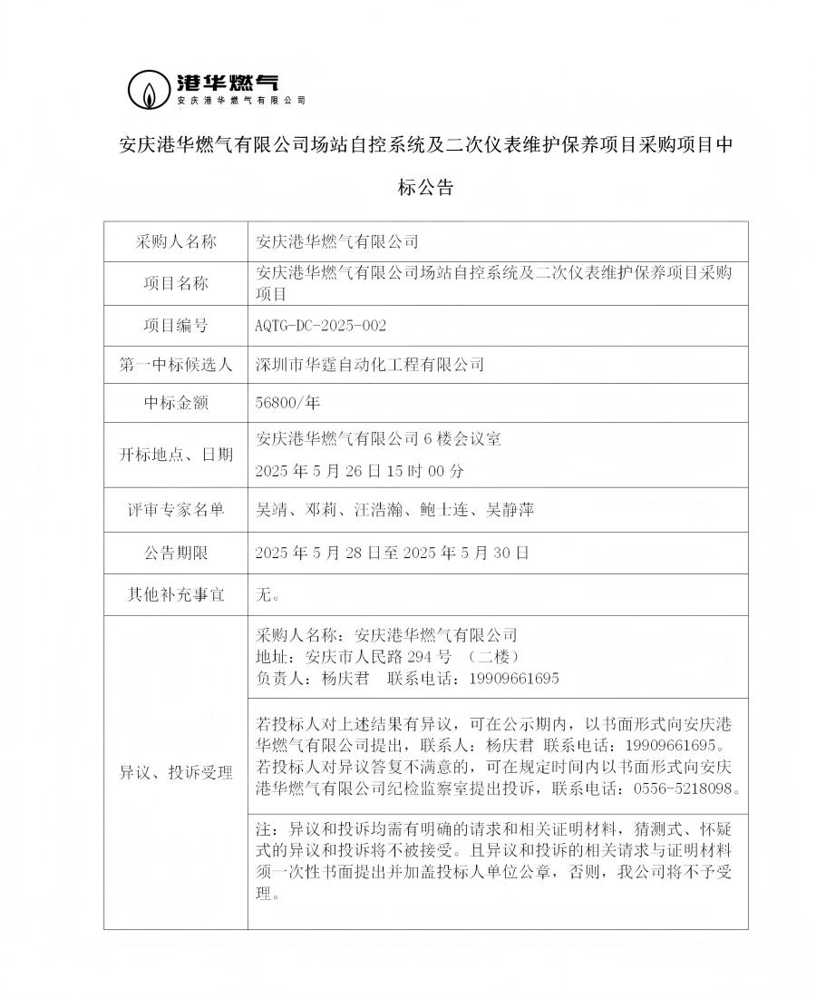 安慶港華燃氣有限公司場站自控系統(tǒng)及二次儀表維護保養(yǎng)項目采購項目中標(biāo)公告