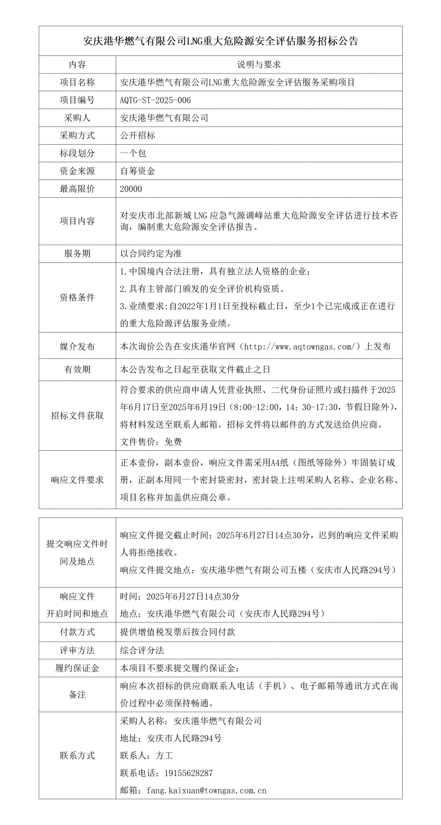 安慶港華燃氣有限公司LNG重大危險源安全評估服務招標公告 發(fā)布時間:2025-06-17    閱讀次數(shù):1489次