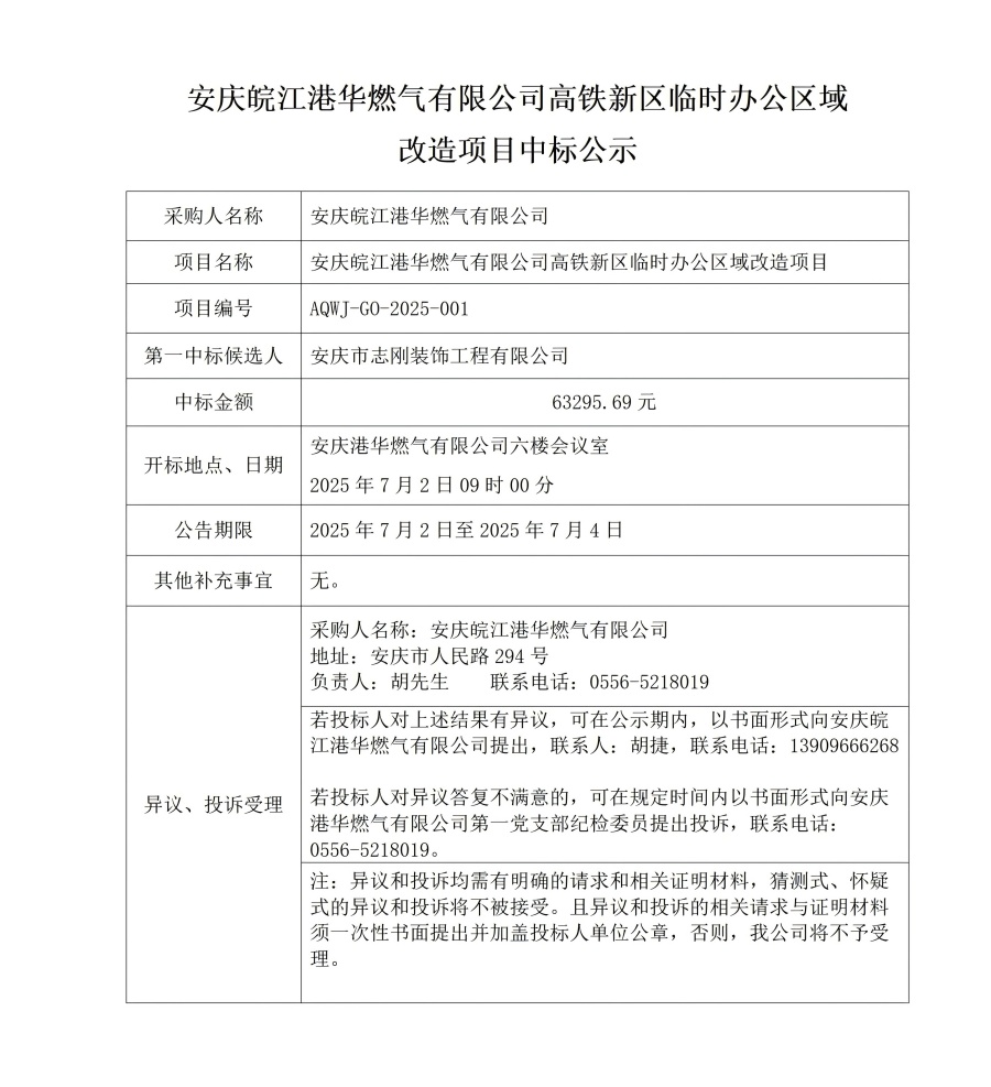 安慶皖江港華燃氣有限公司高鐵新區(qū)臨時辦公區(qū)域改造項目中標公示 發(fā)布時間:2025-07-02    閱讀次數(shù):1494次