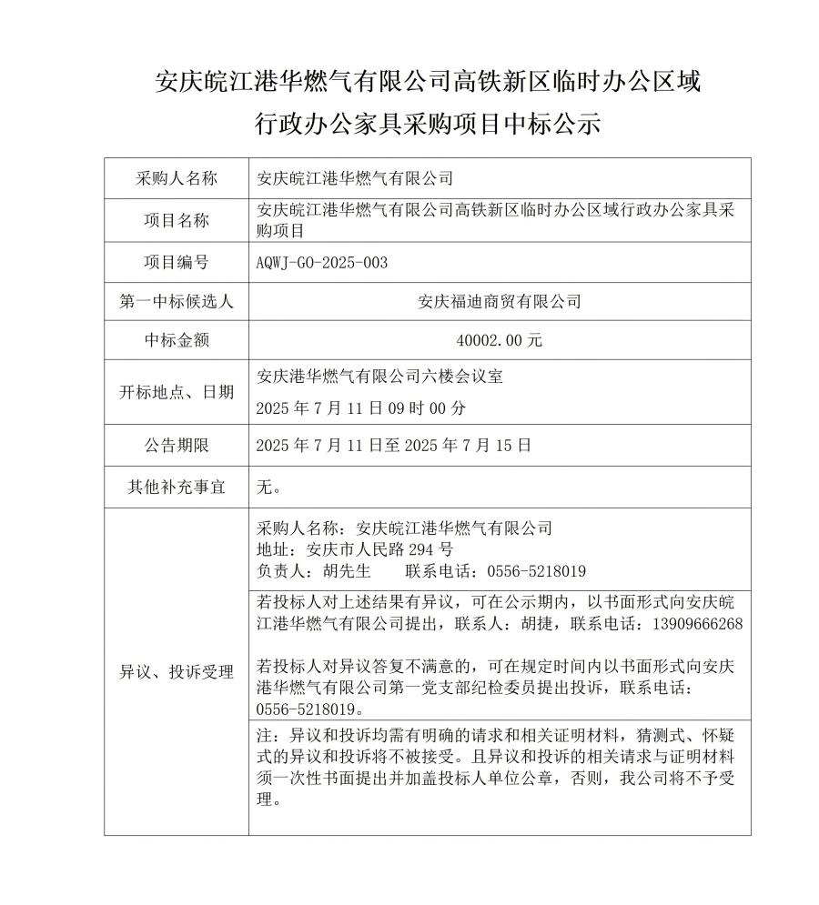 安慶皖江港華燃?xì)庥邢薰靖哞F新區(qū)臨時(shí)辦公區(qū)域行政辦公家具采購項(xiàng)目中標(biāo)公示