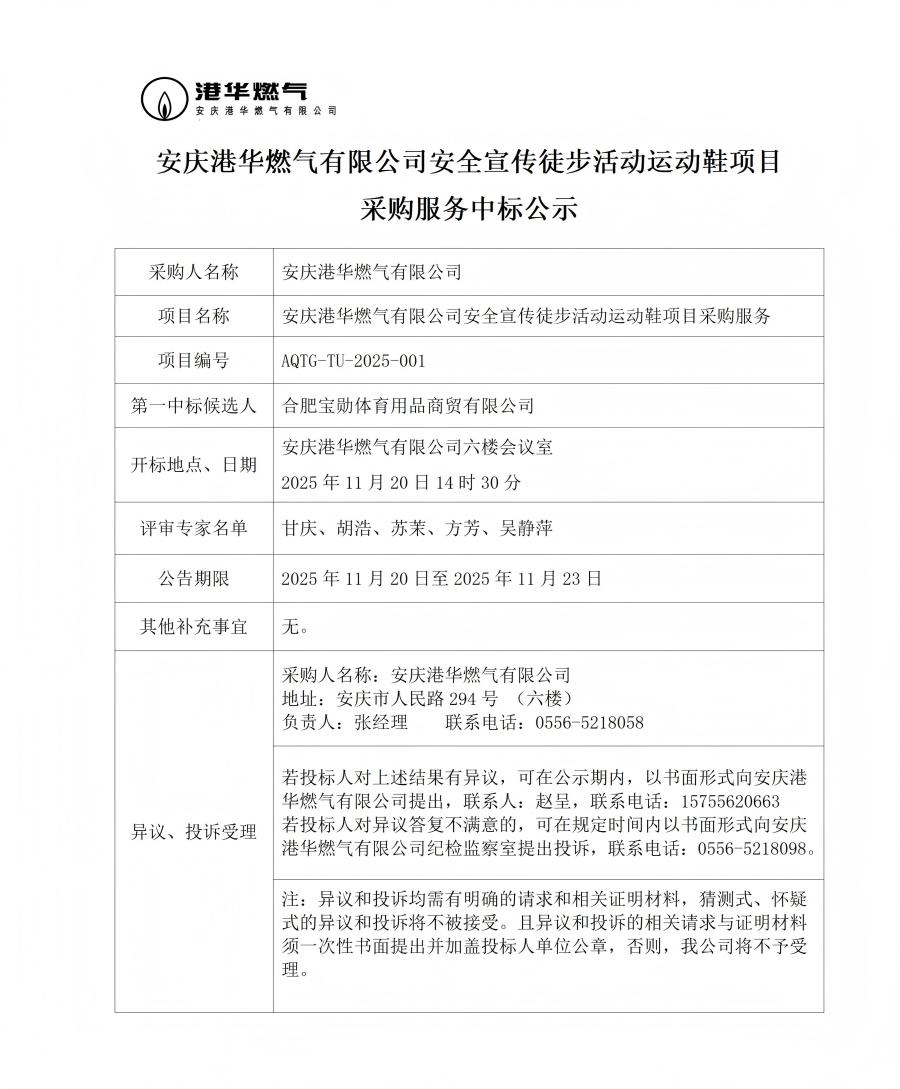 安慶港華燃氣有限公司安全宣傳徒步活動運動鞋項目采購服務中標公示