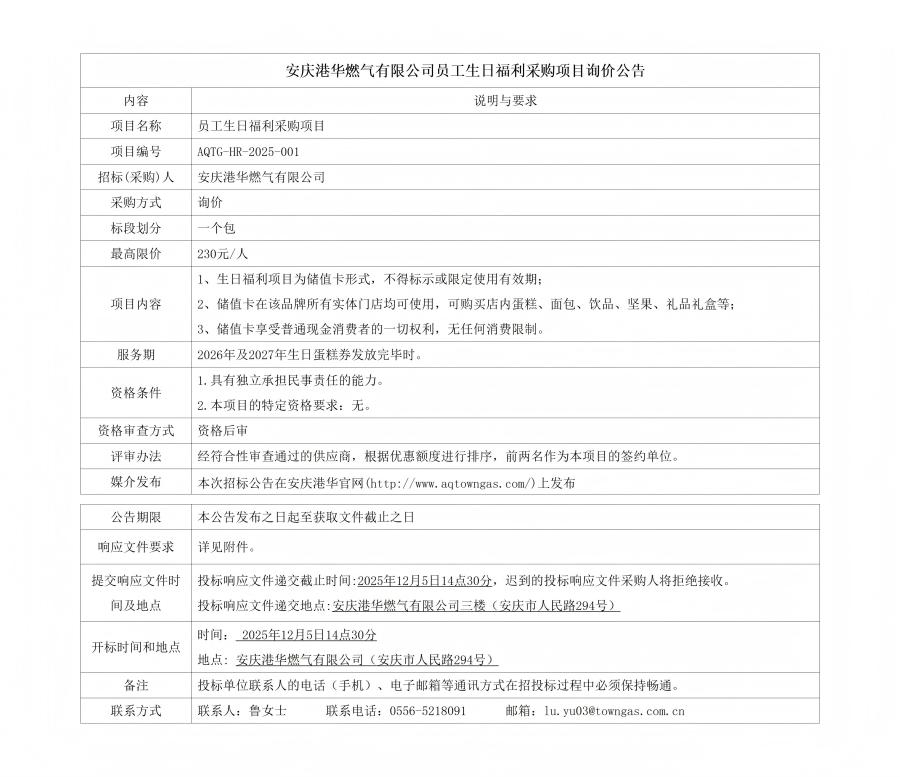 安慶港華燃?xì)庥邢薰締T工生日福利采購(gòu)項(xiàng)目詢(xún)價(jià)公告