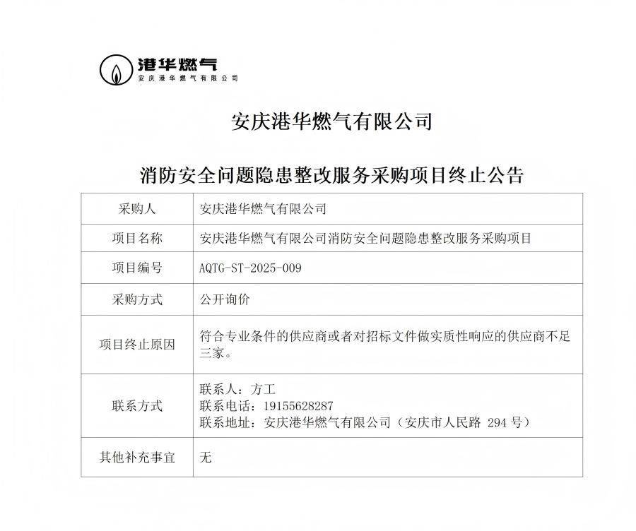 安慶港華燃?xì)庥邢薰鞠腊踩珕栴}隱患整改服務(wù)采購項(xiàng)目終止公告
