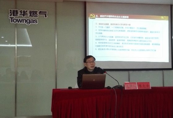 1129日下午,市委講師團(tuán)學(xué)習(xí)宣傳貫徹黨的十九大精神宣講報(bào)告會(huì)在安慶港華會(huì)議室舉行,市委講師團(tuán)副團(tuán)長陳大士作宣講報(bào)告。安慶港華黨委班子成員、公司黨員共60余人聆聽了宣講。